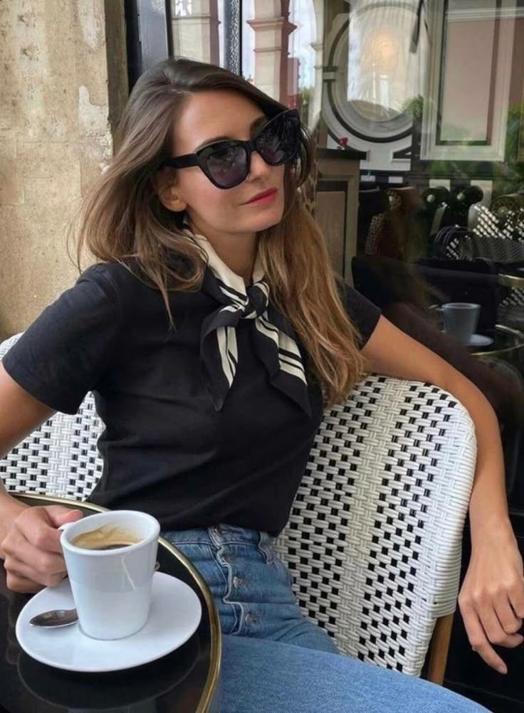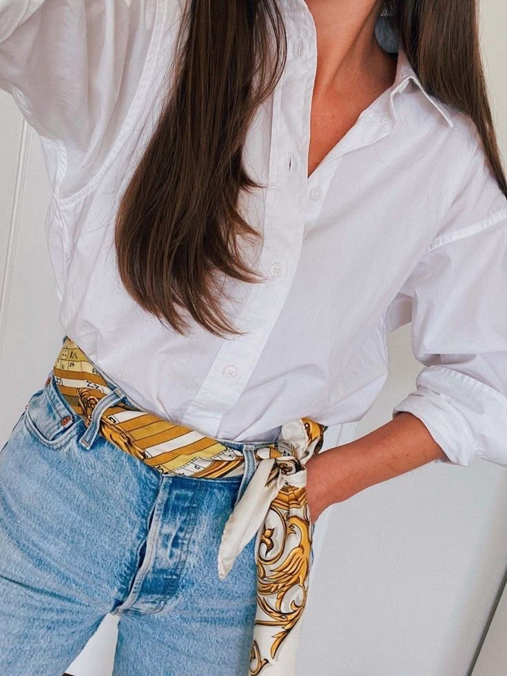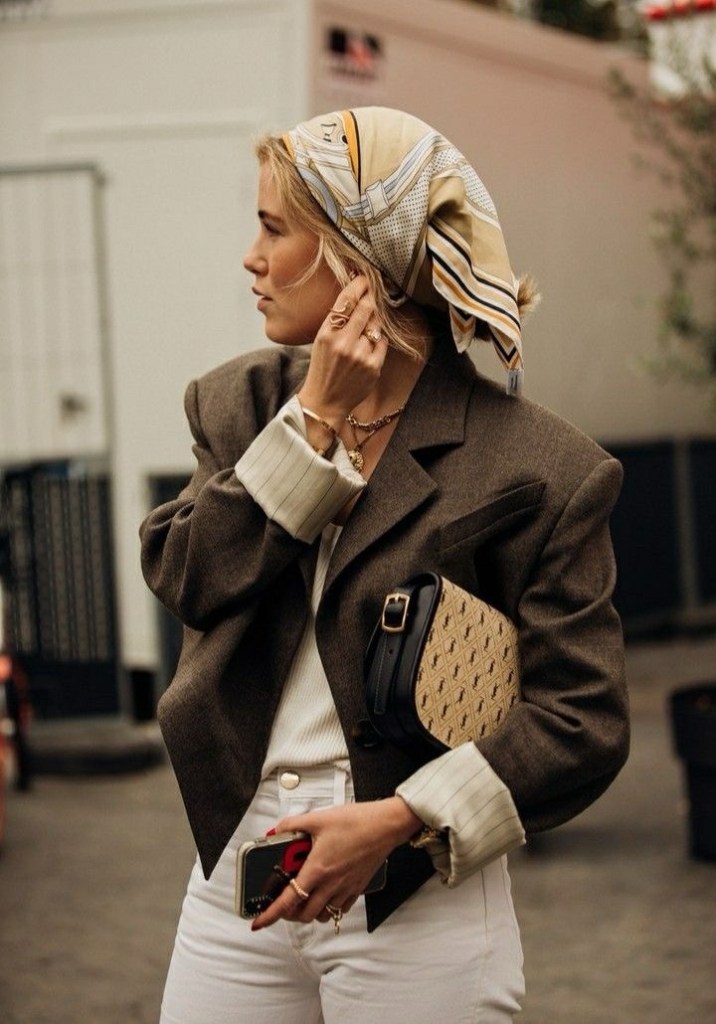 - Neckerchief Chic: annodato stretto al collo su camicia bianca e blazer;